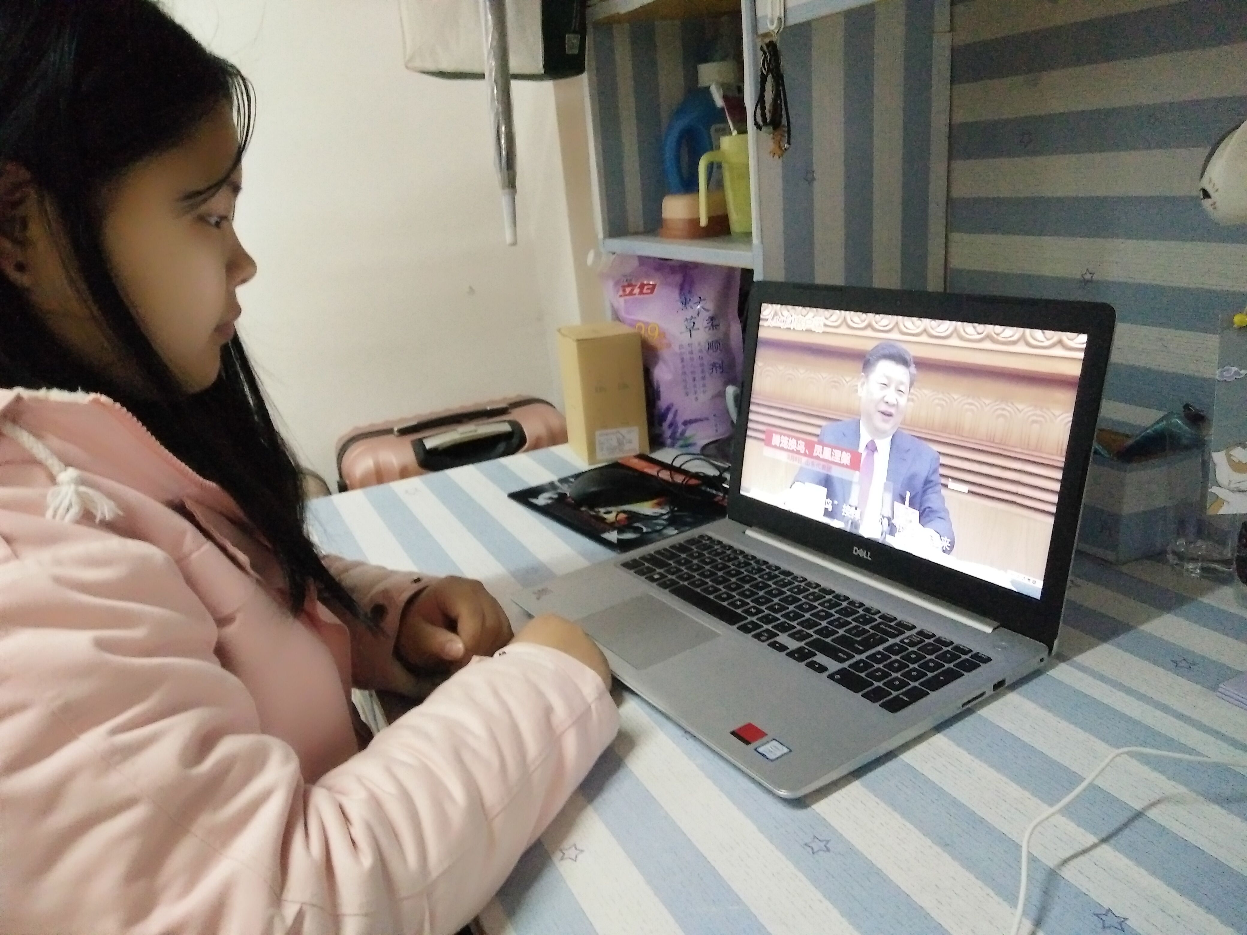 本网讯 3月17日,十三届全国人大一次会议第五次全体会议在北京召开,选举习近平为中华人民共和国主席、中华人民共和国中央军事委员会主席。在办公室、宿舍、食堂,我院学生通过IPAD、手机、电脑等多种方式收看大会直播。