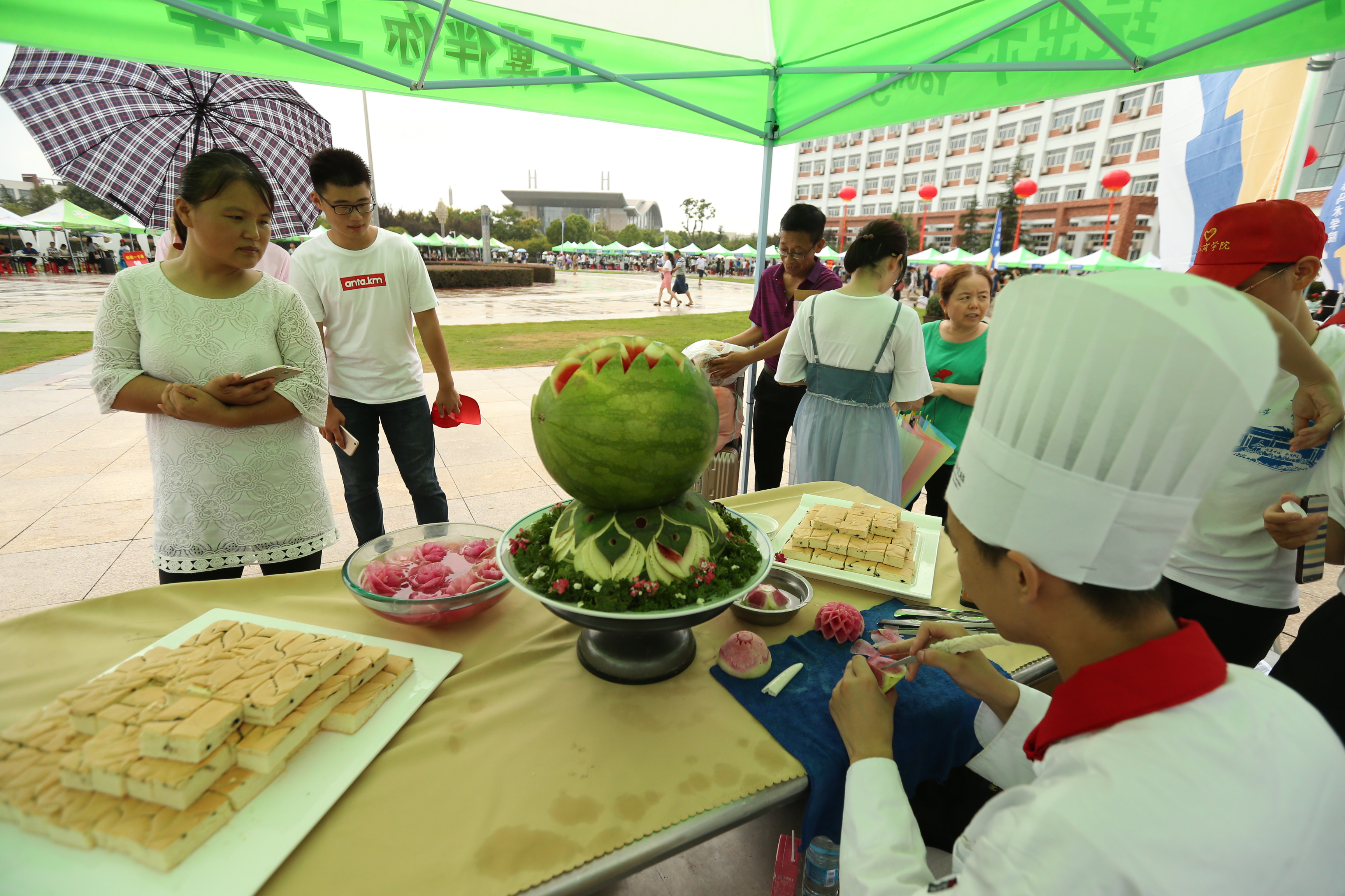 美食展示台上展示了用西瓜花球、菊花豆腐、龙须土豆丝、小蛋糕等精美的食品。很多学生和家长围在美食展台旁,品尝美食、欣赏雕花作品。家长品尝后高兴的说,这种方式迎新很吸引人,既可以展示学生技能,也可以一目了然的了解雕刻的技艺。品尝到学生的小蛋糕后,觉得口感更软糯,吃完后还有一股淡淡的清香。