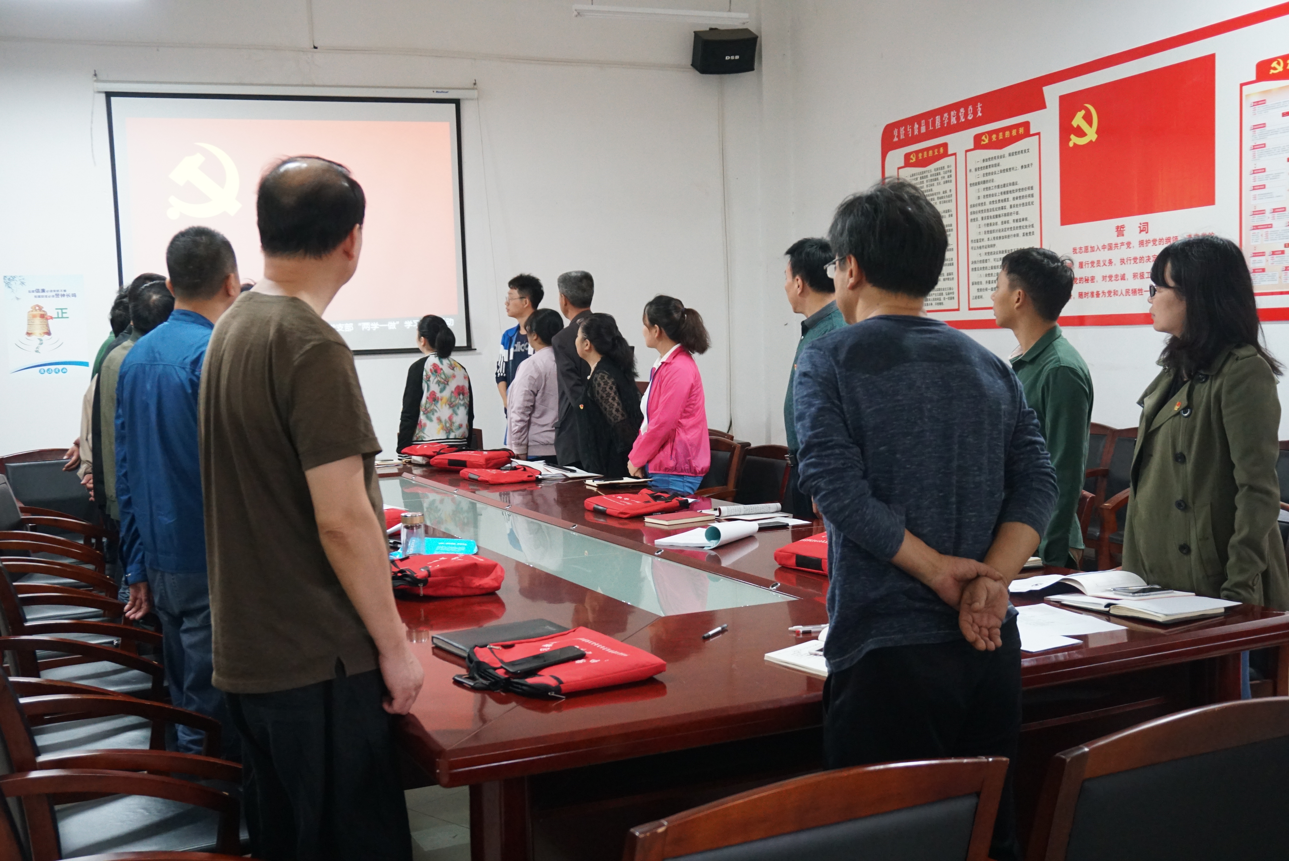 此次党日活动是由教工支部书记丁辉老师主持。会议以佩戴党徽、齐唱《国歌》的形式展开进行,通过学习“习近平出席全国宗教工作会议并发表重要讲话”与“马国强|主持召开市委常委会会议强调坚持‘扫黑务净,除恶务尽’推动扫黑除恶专项斗争不断深入”两项重要文件内容展开。