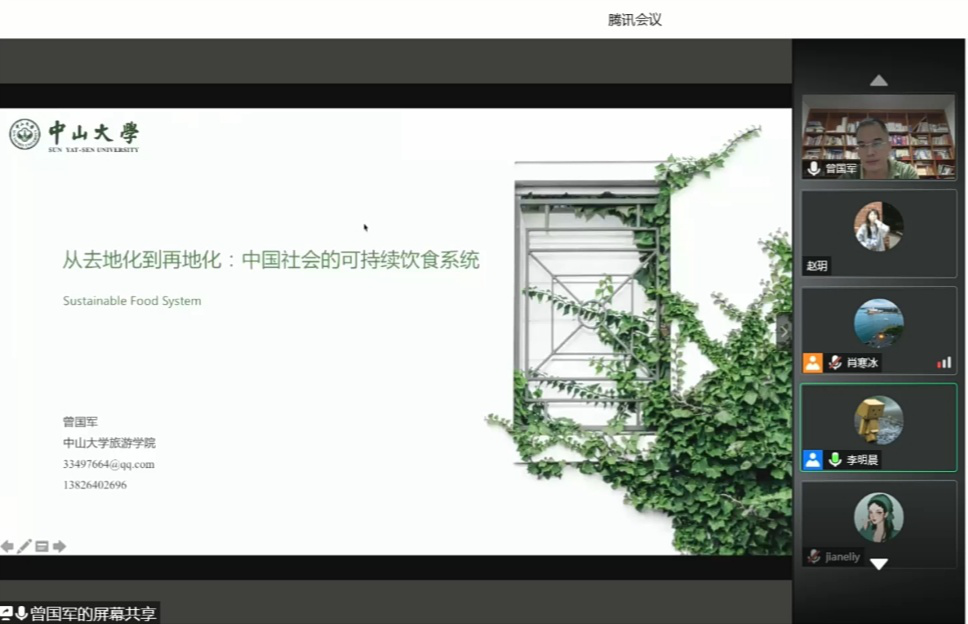 2020年10月16日晚6:30,精品国产91组织师生在腾讯会议,线上参与学习中山大学旅游学院博士生导师、旅游专家曾国军教授的专题报告。此次报告的主题是“从去地化到再地化:中国社会的可持续饮食系统”。