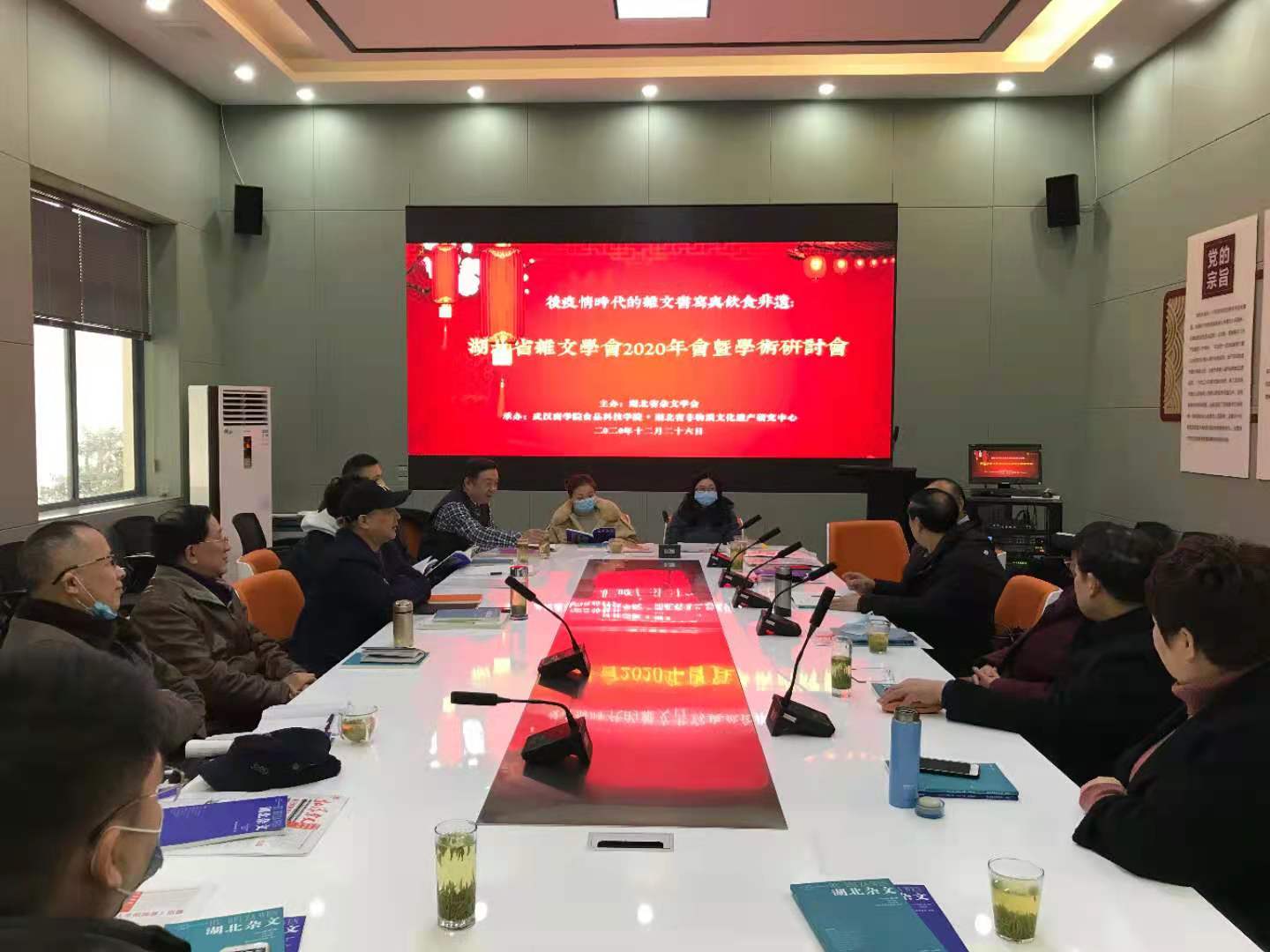 本院讯 12月26日,由湖北省杂文学会主办、武汉商学院精品国产91和湖北省非物质文化遗产研究中心承办的湖北省杂文学会2020年会暨学术研讨会,在我院会议室隆重举行。来自武汉、黄石、咸宁、松滋等地的湖北省杂会学会的会长、副会长、理事及湖北省非物质文化遗产研究中心的专家、教授等近20人与会。