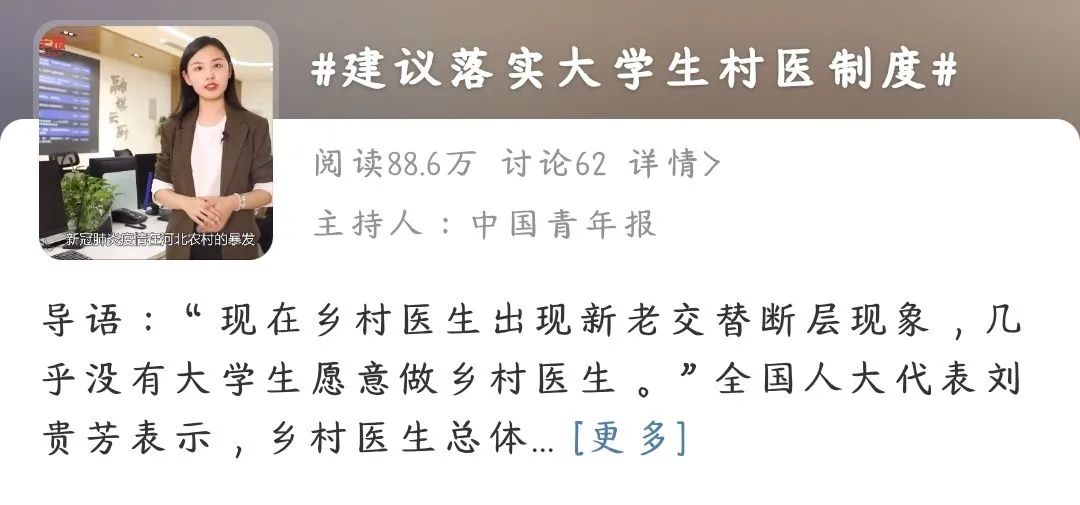“现在乡村医生出现新老交替断层现象,几乎没有大学生愿意做乡村医生。”全国人大代表刘贵芳表示,乡村医生总体数量减少,技术能力下降,建议完善人才引进机制,落实大学生村医制度,实现一村一医(大学生村医),让医学专业的大学生到了农村,能享受与大学生村官一样的待遇。