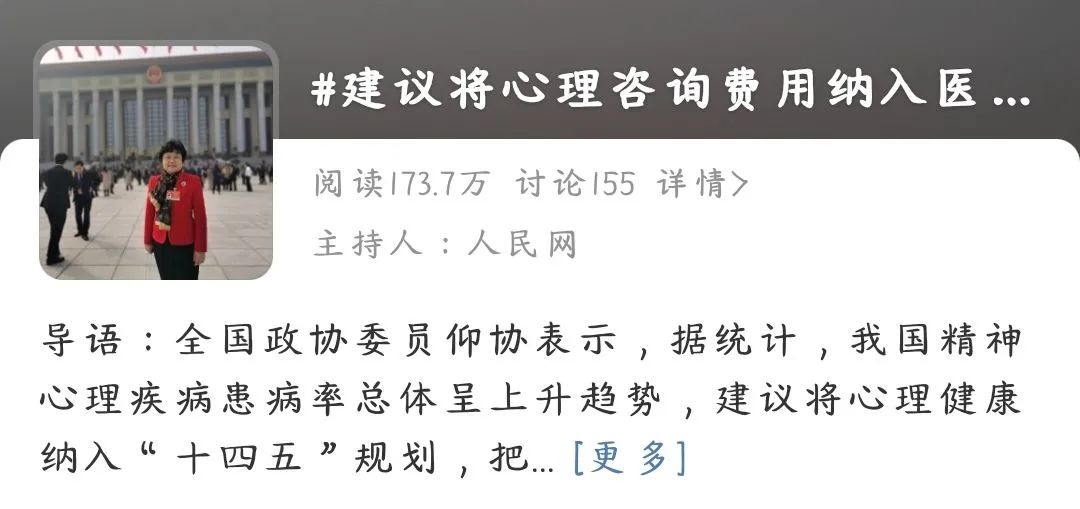 全国政协委员仰协表示,据统计,我国精神心理疾病患病率总体呈上升趋势,建议将心理健康纳入“十四五”规划,把心理咨询、心理健康费用纳入医保报销。