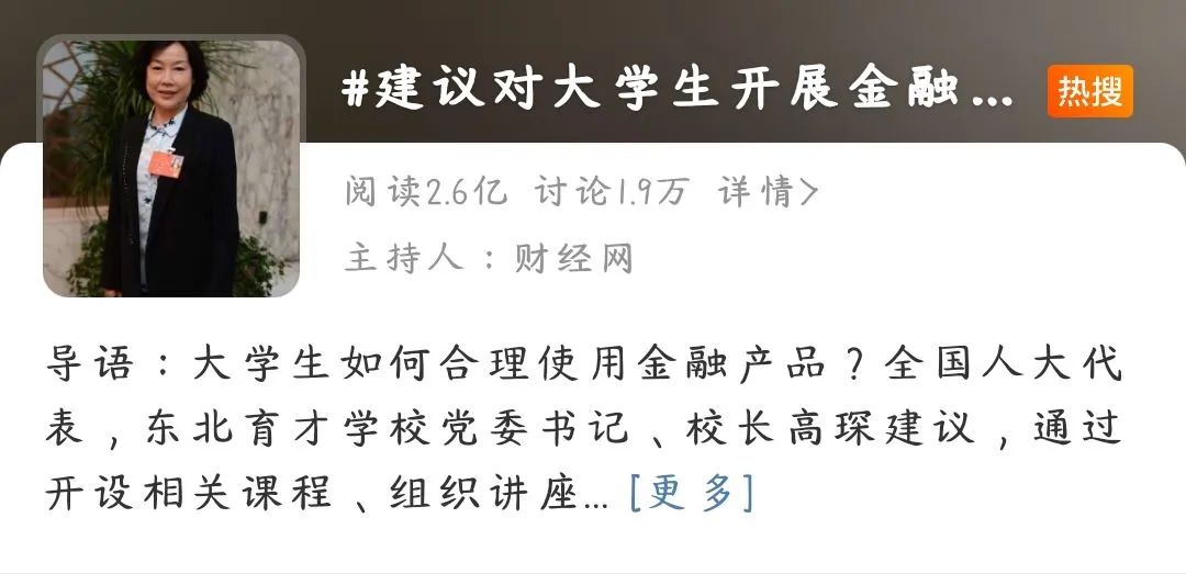 大学生如何合理使用金融产品?全国人大代表,东北育才学校党委书记、校长高琛建议,通过开设相关课程、组织讲座等方式,对学生开展金融知识和金融管理的普及教育,培养学生形成良好的金融素养。