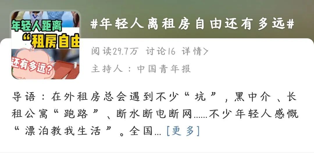 在外租房总会遇到不少“坑”,黑中介、长租公寓“跑路”、断水断电断网......不少年轻人感慨“漂泊教我生活”。全国政协委员胡卫呼吁,要让购房补贴、专项扣除、廉租房等政策更加普惠,适当延长公租房的租用年限,对公租房价格进行统一指导,价格不应过高,让年轻人有机会租到更平价的房子。