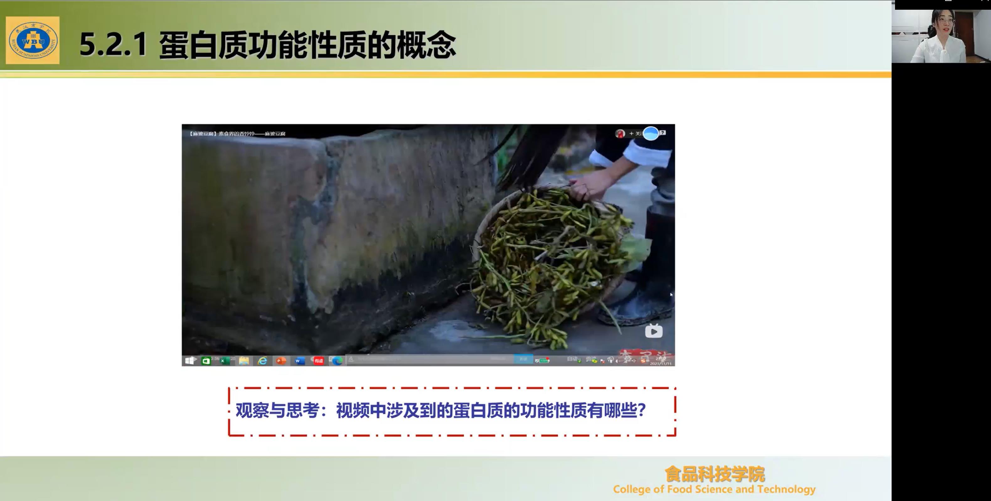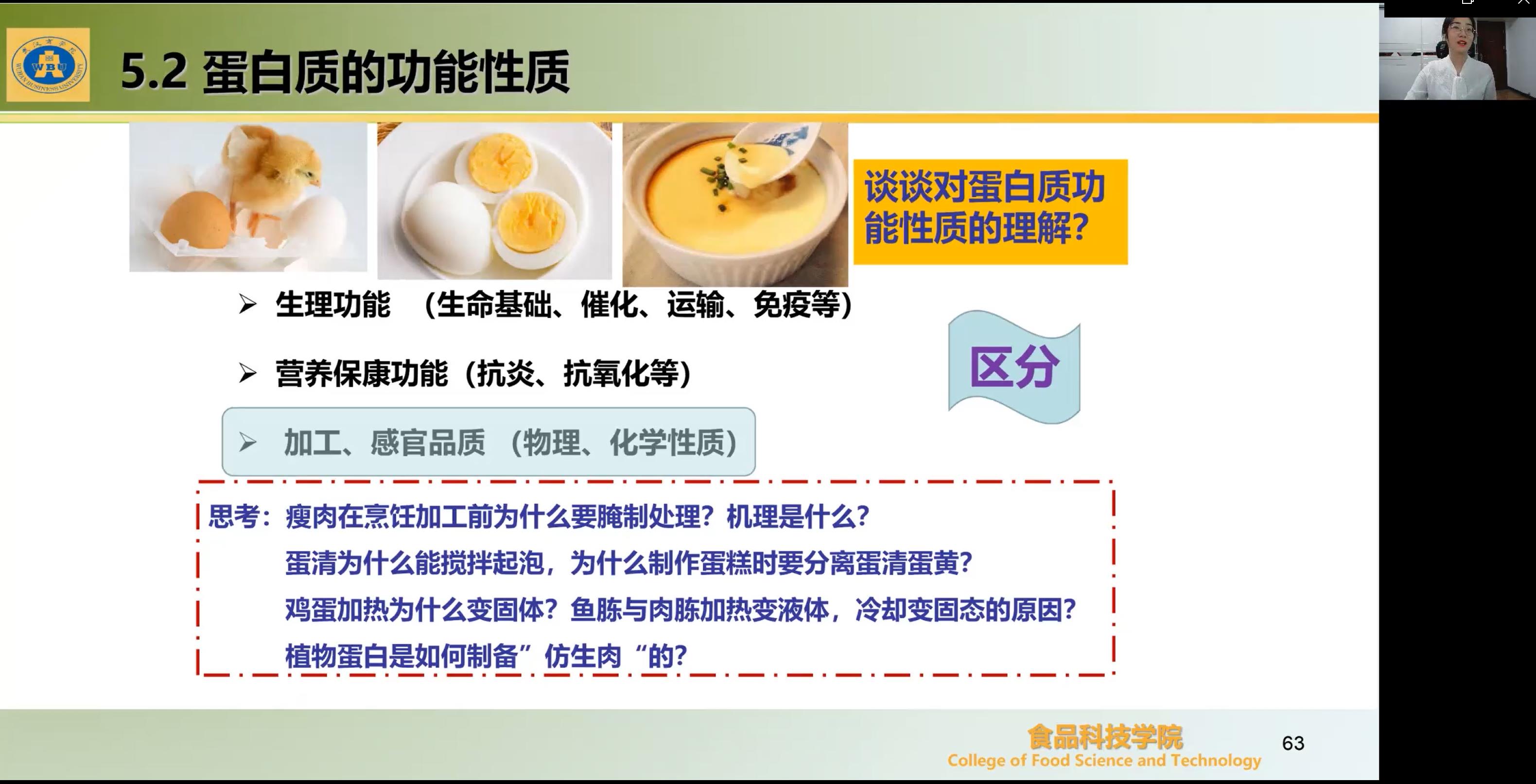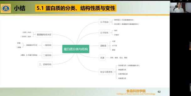 精品国产912022年“教学质量月”系列活动之智慧课堂展示课,于11月11日上午以线上课的方式进行,由学院青年教师裴亚琼博士主讲,讲授内容为《食品化学》第五章第二节蛋白质功能性质,学院全体教师线上参与观摩。