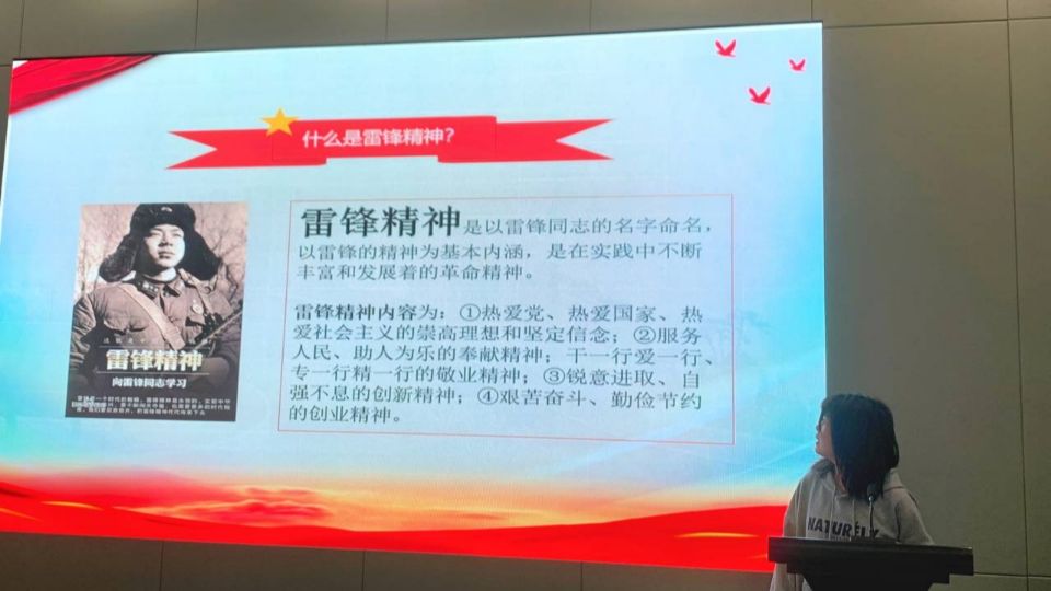 活动分为三个阶段。第一阶段,讲解党的二十大精神。由团支部组织委员郭苏研同学为团员们介绍党的二十大报告,讲解党的二十大精神。第二阶段,讲解雷锋精神。团支部宣传委员丁亦晨同学从介绍雷锋同志、介绍雷锋精神、如何学习雷锋精神及雷锋精神的积极意义四个方面倡导当代大学生应主动学习雷锋精神。第三阶段,总结陈词。最后,团支部书记胡木同学就国家方面强调了雷锋精神的时代价值,并希望同学们将雷锋精神贯彻于心。